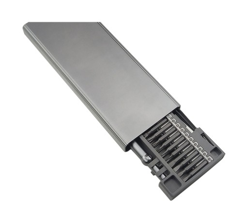 Konstrukcja opakowania na bity posiada wbudowane mocne magnesy unieruchamiające je w otworach.