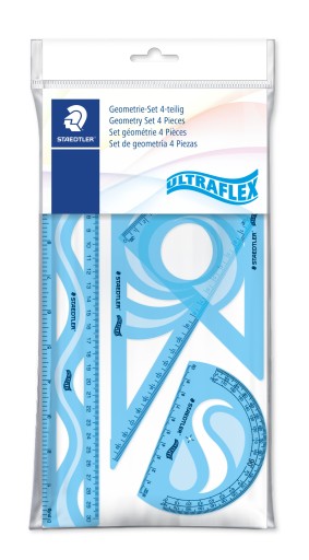 - Zestaw zawiera linijkę 30 cm, kątomierz i ekierkę 60°/30° i 40°/45°.