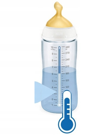Aby mieć pewność, że pokarm podawany nie będzie zbyt gorący, butelka NUK First Choice+ posiada wskaźnik temperatury Nuk. Wskaźnik wygląda jak termometr i jest umieszczony pomiędzy kreskami podziałki. Wskaźnik zmienia kolor pod wpływem zmiany temperatury zawartości butelki.