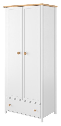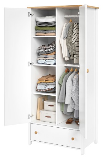 Szafa z serii STORY została wyposażona w dwa drążki na wieszaki, półki oraz szufladę.