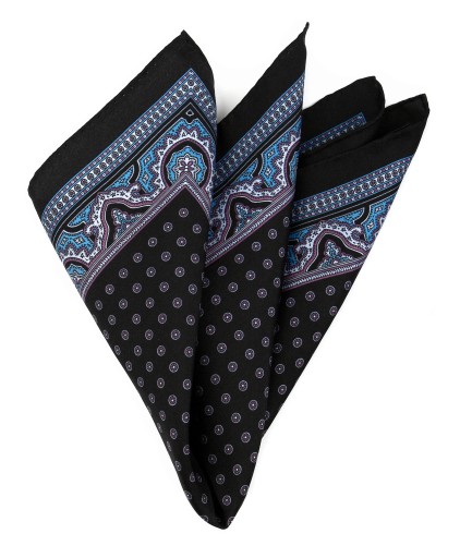 Jedwabna czarna poszetka w fioletowe groszki otoczona ornamentalną ramką w kolorach niebieskim, błękitnym oraz fioletowym. Całość wykończona rolowaniem, dzięki czemu poszetka lepiej się układa w brustaszy.