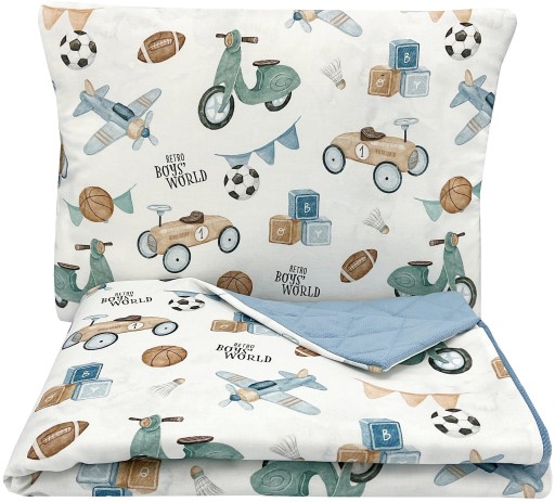 W skład kompletu wchodzi kocyk 70x100cm oraz płaska podusia 30x40cm.