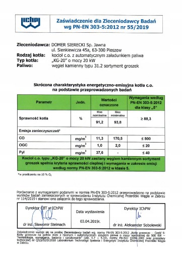 Kotły z serii KG ECO posiadają 5 klasę emisji spalin zgodnie z normą PN-EN 303.5:2012 oraz spełniają wszystkie wymagania dyrektywy europejskiej ECODESIGN 2020.