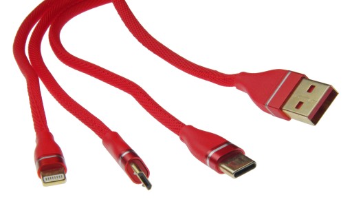 Kabel USB w tekstylnym oplocie posiadający posiadający 3 różne zakończenia: Lightning (iPhone, iPad), USB typu C oraz microUSB