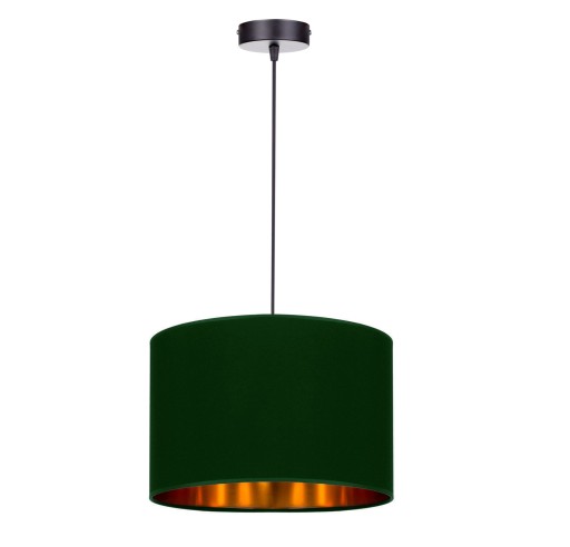 Okrągły zielony abażur w kształcie walca ze złotym wnętrzem, który jest umieszczony na czarnym stelażu i zawieszony na regulowanej lince idealnie komponujesię w całość i stanowi uzupełnienie nowoczesnych wnętrz.