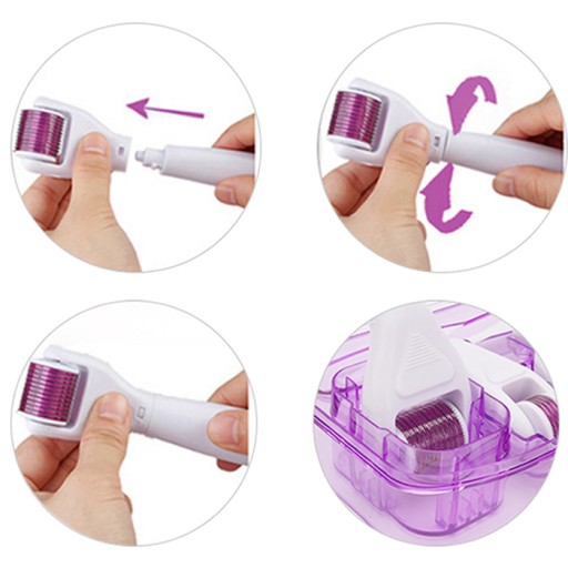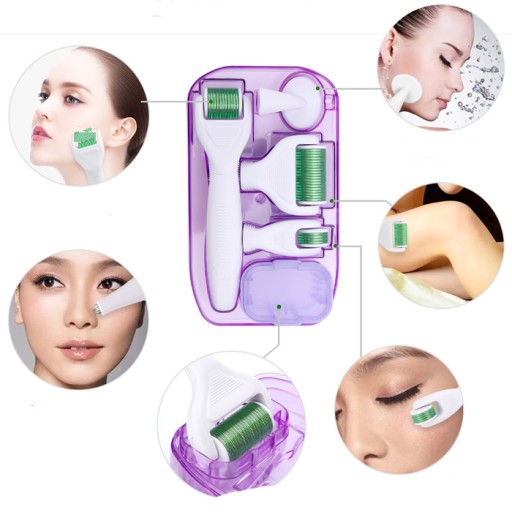 Ten zestaw rolek derma działa na naskórek skóry,posiada 4 głowice różnej liczbie igieł i szczoteczką do twarzy.