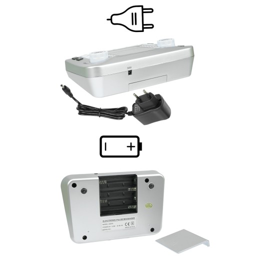 Elektrostymulator może być zasilany bateryjnie lub poprzez zasilacz.
