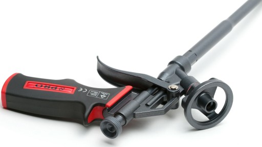 - Zablokowanie pistoletu pokrętłem regulacji przepływu znajdującym się w tylnej części narzędzia, przy jednocześnie zamocowanym pojemniku z pianą, umożliwia ponowne jego użycie do 20 dni bez konieczności czyszczenia.