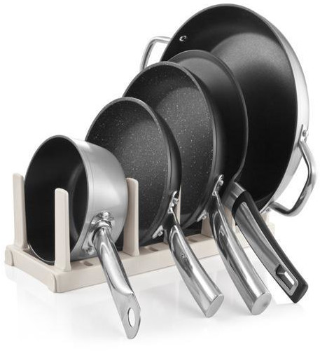Doskonały do przejrzystego przechowywania aż 5 patelni, miejsce na patelnie można dostosować do ich rozmiaru. Posiada 4 antypoślizgowe nóżki. Gwarancja 3-letnia.