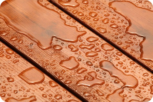 Olej wnika głęboko w strukturę drewna, skutecznie chroni je przed wnikaniem wody i zabrudzeniami. Po olejowaniu można z łatwością zauważyć, że krople łączą się w większe skupiska i utrzymują się na powierzchni drewna.