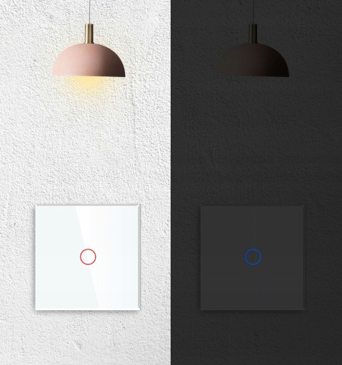 ✔️ Szklany panel posiada kolorowe podświetlenie przycisku dotykowego. Gdy światło jest włączone, przycisk świeci się delikatnie czerwonym kolorem, który w ciemności pomaga zlokalizować włącznik, gdy światło jest wyłączone świeci na niebiesko.