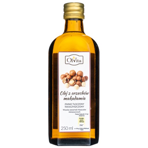 Olej z orzechów makadamia zimnotłoczony, nieoczyszczony, nierafinowany pozyskano w wyniku tłoczenia na zimno nieprażonych orzechów makadamia. Niezwykle delikatny w smaku i zapachu, a dodatkowo wartościowy dodatek tłuszczowy w diecie.