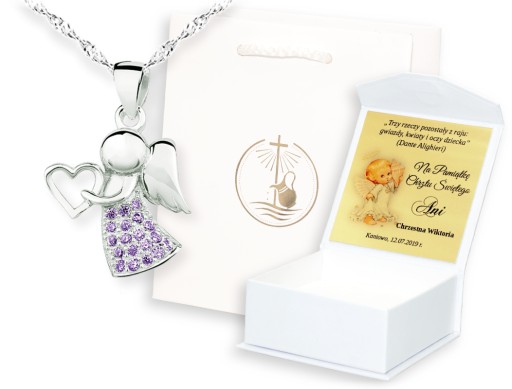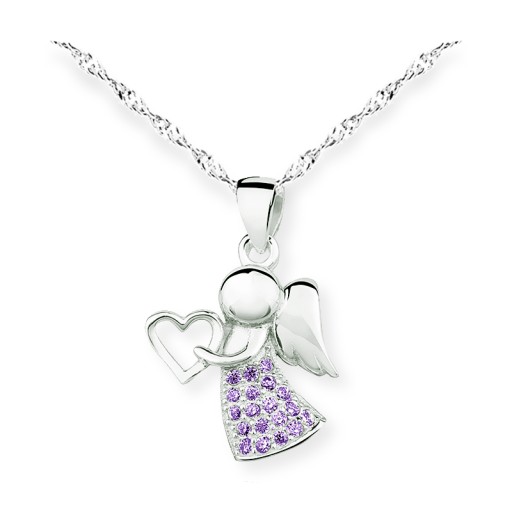 Piękny symboliczny Srebrny Aniołek Stróż z Fioletowymi Cyrkoniami.