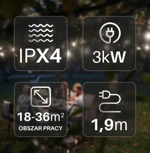 Minimalna wysokość montażowa: 1,8 m od podłogi lub dowolnej powierzchni typu stół, szafka, itp. (mierzone od dołu lampy grzewczej).