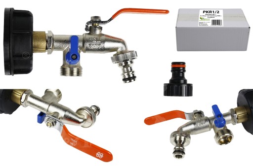 💦 Nakrętka została wykonana z wysokiej jakości tworzywa sztucznego, dodatkowo zastosowanie olejoodpornej uszczelki zapewnia wytrzymały i szczelny montaż na kontenerze. Metalowy kran umożliwia podłączanie dwóch węży ogrodowych o średnicy 1/2”, na którym jest już zamontowane szybkozłącze.
