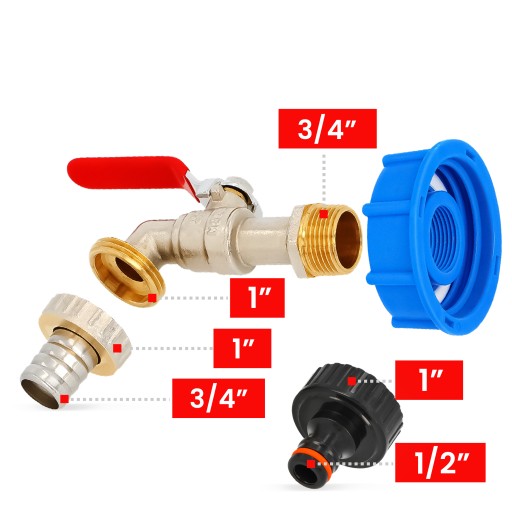 Zawór czerpalny z dławikiem 3/4'' GZ x 1'' GZ z przyłączem na wąż 1'' GW x 3/4'' W, przyłączem pod szybkozłączke 1'' GW x 1/2'' SZ i złączem IBC S60x6 2'' GW x 3/4" GW