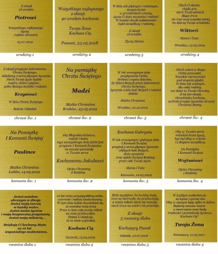 Jeżeli nie otrzymamy takiej informacji przy zakupie w zakładce "wiadomość dla sprzedającego" otrzymasz produkt w standardowym (brązowym) pudełeczku bez tabliczki z dedykacją.