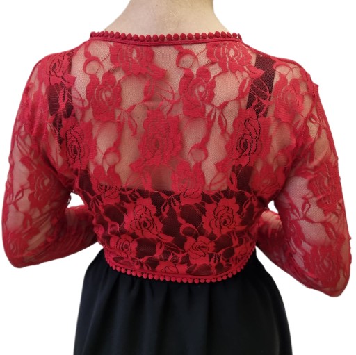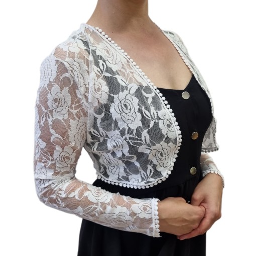 Zapraszam do zakupu bolerka z długim rękawem z pięknej elastycznej koronki w różyczki.