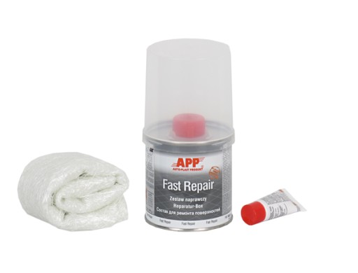 APP Fast Repair to zestaw naprawczy przeznaczony do wypełniania dużych ubytków materiału, perforacji powierzchni metalowych, a także do wzmacniania miejsc osłabionych korozją. Posiada doskonałą przyczepność do regenerowanej powierzchni. Umożliwia szpachlowanie blach karoseryjnych, rur, sprzętu campingowego i pływającego wykonanego z elementów metalowych i laminatów. W zestawie znajdują się żywica poliestrowa, utwardzacz oraz mata z włókna szklanego o powierzchni 0,20 m2. Żywica ma bardzo dużą wytrzymałość na naprężenia mechaniczne, drgania i wibracje oraz podwyższoną temperaturę, działanie olejów i smarów.