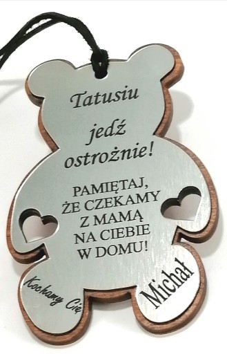 Zawieszka wykonana jest ze sklejki brzozowej, bejcowanej i zabezpieczonej lakierem ekologicznym, a strona zewnętrzna pokryta jest laminatem w kolorze srebrnym. Na laminacie został wygrawerowany napis , oraz imiona osób bliskich, które czekają na kierowcę w domu. Grawerowanie jest metodą trwałą i nie ulegnie zmazaniu. Do zawieszki dołączony jest rzemyk ze skóry naturalnej (kolor dobieramy losow