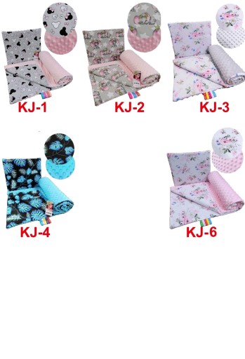 Kocyk jest dwustronny. Z jednej strony jest tkanina bawełniana ( za wyjątkiem pikowanej w gwiazdki - poliester) a z drugiej bardzo milutka i cieplutka w dotyku dzianina VELVET o splocie cegiełki lub MINKY z wytłoczeniem w bąbelki. Wewnątrz jest ocieplacz odzieżowy o gęstości 120g/m2- kocyk i 400g/m2 podusia