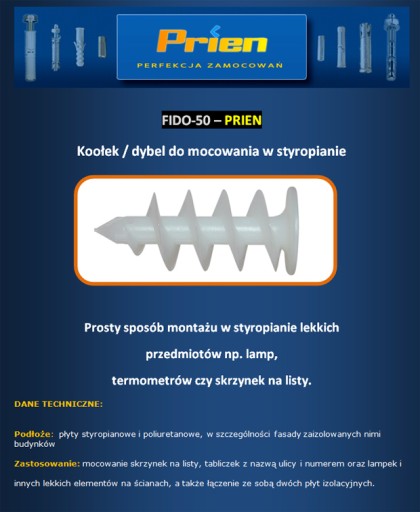 Kołki do styropianu 50. Służą do praktycznego montażu w styropianie. Wykonany z twardego materiału, posiada szczególną wytrzymałość mechaniczną oraz wytrzymałość na działanie czynników zewnętrznych. Do montażu kołka używać końcówki TORX 40. Przy montażu w otynkowanej elewacji nawiercić otwór fi8.
