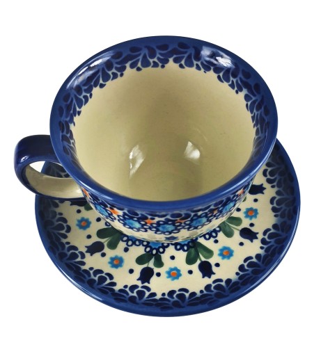 FILIŻANKA ZE SPODKIEM MALOWANA W TRADYCYJNEJ DEKORACJI BOLESŁAWIEC