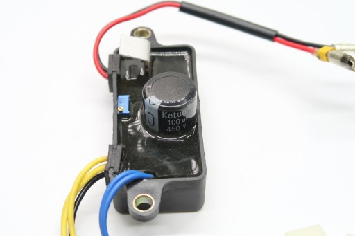 Nowy regulator napięcia (AVR) - (100uF, 450V).Pasuje do agregatów o mocy od 2 do 3KW 3 fazy. Rozstaw pomiędzy otworami (od środka do środka) - ok.100mm. Zastępuje często spotykane regulatory w kształcie banana.