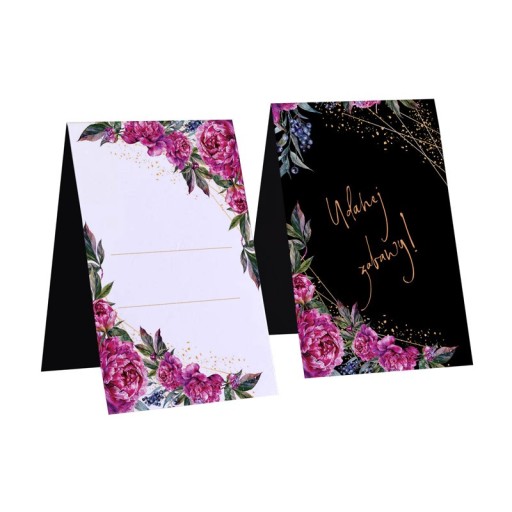 - nadruk: z jednej strony wizytówki mają czarny nadruk z grafiką kwiatów i napisem Udanej zabawy, druga strona jest biała z grafiką kwiatów i miejscem na nazwiska