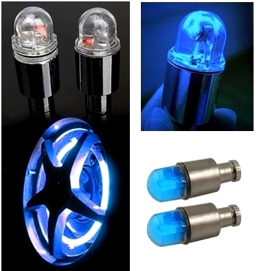 Zestaw dwóch tuningowych świecących nakładek na wentyl samochodowy, motocyklowy lub rowerowy.