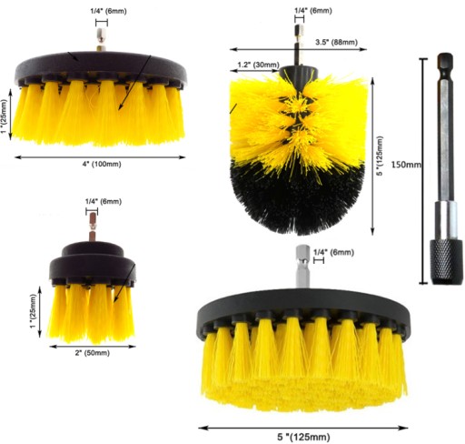 - Zestaw 4 szczotek o różnych kształtach i średnicy umożliwia szybkie i skuteczne czyszczenie mocno zabrudzonych powierzchni i trudno dostępnych miejsc