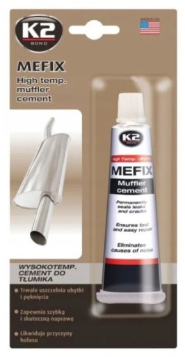 K2 MEFIX to wysokotemperaturowy cement przeznaczony do montażu i napraw zarówno nowych jak i starych układów, rur wydechowych, katalizatorów. Uszczelnia dziury i pęknięcia. Poddany działaniu wysokiej temperatury twardnieje jak stal. Łatwo się rozprowadza. Po utwardzeniu nie kurczy się i nie kruszy, wodoodporny.