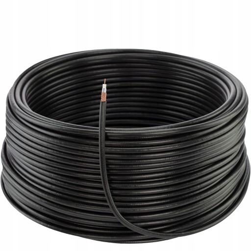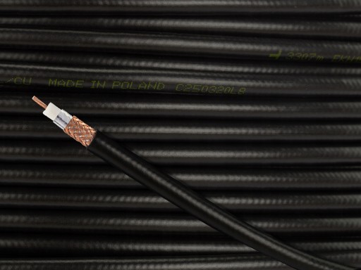 Przewód współosiowy polskiej produkcji o żyle wielodrutowej miedzianej, izolacji polietylenowej i powłoce polwinitowej, podwójnie ekranowany.
