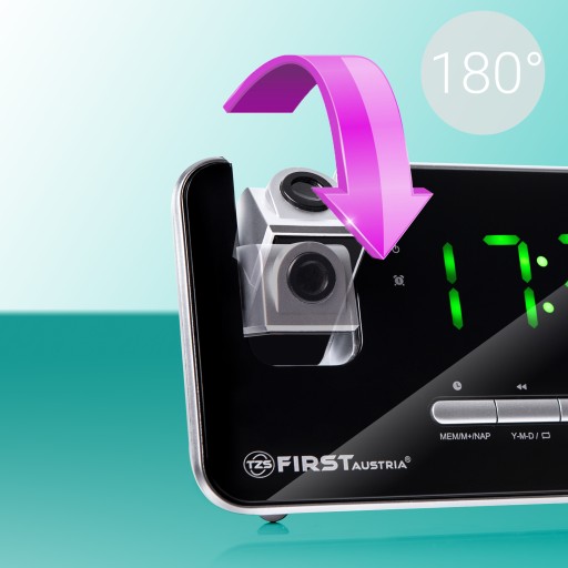 Radiobudzik genialnie się prezentuje w każdej przestrzeni, został wykonany z wysokiej jakości czarnego, połyskliwego tworzywa sztucznego, zaopatrzony w obrotowy projektor o 180 stopni.