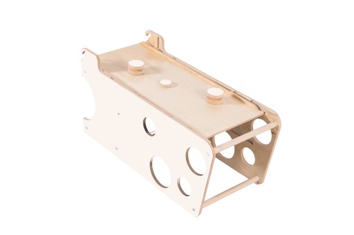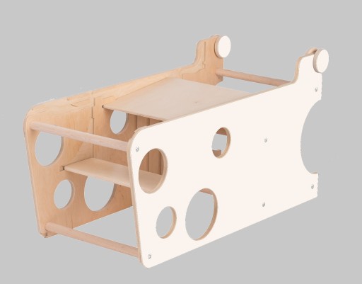 Kitchen Helper/Learning Tower ZESTAW poza podstawowym zastosowaniem jako Kitchen Helper i stolik dla dziecka z krzesełkiem, w wersji jako zestaw posiada dodatkową, dwustronną tablico/zjeżdżalnię, która może też być dodatkowym blatem. Wraz z kółkami i drewnianymi figurami załączonymi do zestawu może służyć do wspólnej zabawy w tzw AIR HOCKEY.