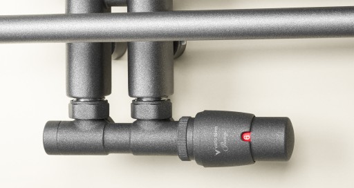 Zestaw z galerii zamontowany jest na grzejniku Dewon. Zalecamy tak dobierać grzejnik, by głowica podążała za bryłą grzejnika Dewon (można zamówić grzejnik o odwrotnej asymetrii). Zawór pasuje również do grzejników Helios.