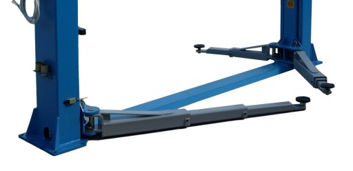 4T udźwig podnośnika w połączeniu z idealnie dopasowanymi ramionami to główne zalety prezentowanego modelu. Zarówno przednie jak i tylne ramiona podnośnika posiadają 3-sekcyjną konstrukcję teleskopową. Najkrótszy rozstaw ramion (690mm) umożliwia podnoszenie małych pojazdów osobowych. Maksymalny rozstaw ramion (1600mm) jest niezbędny do stabilnego ustawienia i bezpiecznej obsługi długich aut dostawczych. Ramiona w podnośniku są asymetryczne i rozkładają się na zewnątrz, dzięki czemu możliwe jest zachowanie optymalnej równowagi podnoszonego pojazdu. W standardowym wyposażeniu podnośnika znajdują się dwa komplety dystansów o wysokości 52mm oraz 120mm. Są one niezbędne przy obsłudze aut dostawczych z plandeką, oraz samochodów terenowych podnoszonych za ramę. Podpory umieszczane pod pojazdem są wykręcane oraz wpinane na zatrzask do ramion i dystansów.
