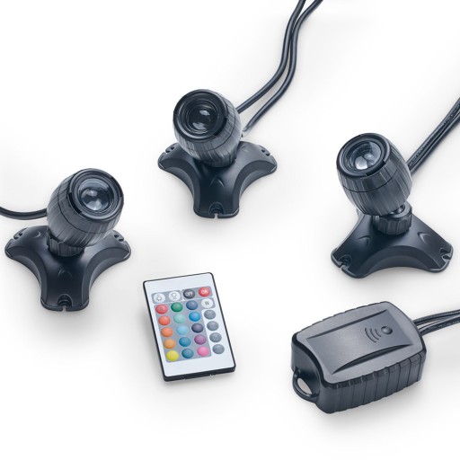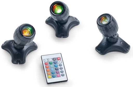 Kolorowe oświetlenie oczka wodnego i ogrodu: 3 energooszczędne reflektory z transformatorem i pilotem zapewniają nastrojowe kolorowe i białe oświetlenie LED w oczku wodnym i ogrodzie. Nadaje się do użytku nad i pod wodą (IP 68) i zawiera transformator bezpieczeństwa 12 V oraz kabel o długości 2m + 3m + 2x 2m.