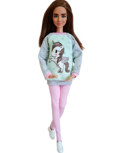 Przedmiotem sprzedaży jest komplet dla lalek z plastikowymi nogami tj. bluza i getry. Góra uszyta z miętowej dzianiny w druku cyfrowym z uroczym jednorożcem w połączeniu z melanżem. Zapinana na delikatny rzep. Getry długie różowe na gumce.