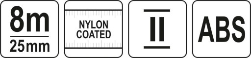 Miara zwijana z taśmą stalową, wykonana w II klasie dokładności. Taśma ze specjalnej , sprężystej blachy , lakierowana i dodatkowo zabezpieczona powłoką nylonową chroniącą przed wilgocią , ścieraniem a także blaknięciem pod wpływem światła słonecznego. Zakończona ruchomym hakiem /przystosowanym do pomiarów wewnętrznych i zewnętrznych /. Kolor taśmy żółty , na górnej i dolnej krawędzi naniesiona podziałka milimetrowa . Zwarta obudowa wykonana z odpornego na uszkodzenia mechaniczne tworzywa abs , wzmocniona aplikacjami z czarnej gumy /tpr /. Dla wygody użytkownika wyposażona w klips mocujący i krótką smycz.
