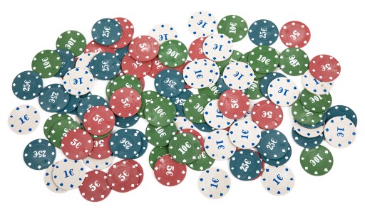 - 100 profesjonalnych żetonów ( łącznie 1025 Euro!) odpornych na ścieranie w kolorach 25x niebieski (25€), zielony (10€), czerwony (5€) i biały (1€),