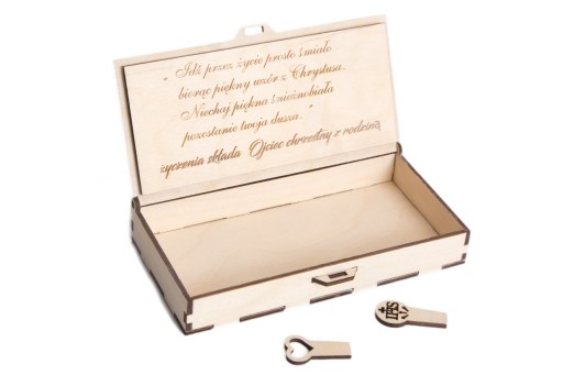 Pudełko wykonane ze sklejki o grubości 3mm , elementy wycinane i grawerowane laserowo