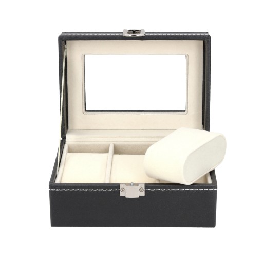 Wnętrze wyściełane jest miękkim, kremowym materiałem, który chroni zegarki przed zarysowaniami i uszkodzeniami. Dzięki szklanemu okienku możesz podziwiać swoją kolekcję bez konieczności otwierania pokrywy, a solidny metalowy zamek gwarantuje bezpieczeństwo przechowywanej biżuterii.