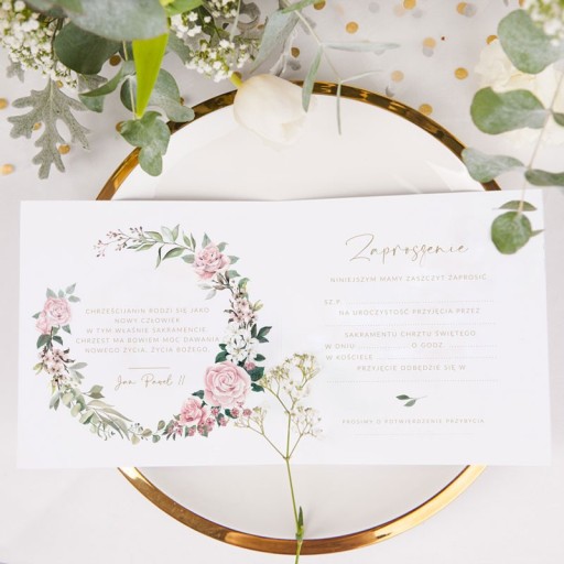 - nadruk: matowy; zaproszenia zdobione są nadrukiem kwiatowego wianuszka, drewnianego krzyżyka i złotym napisem Chrzest Święty oraz Zaproszenie; okładka zaproszenia posiada ramkę w kraftowym kolorze