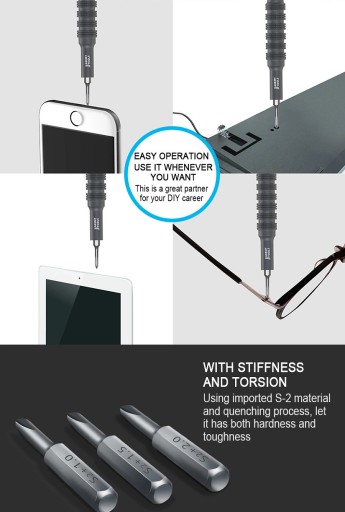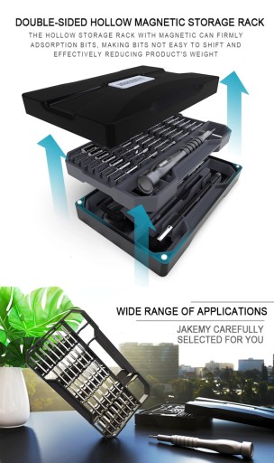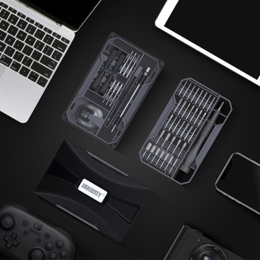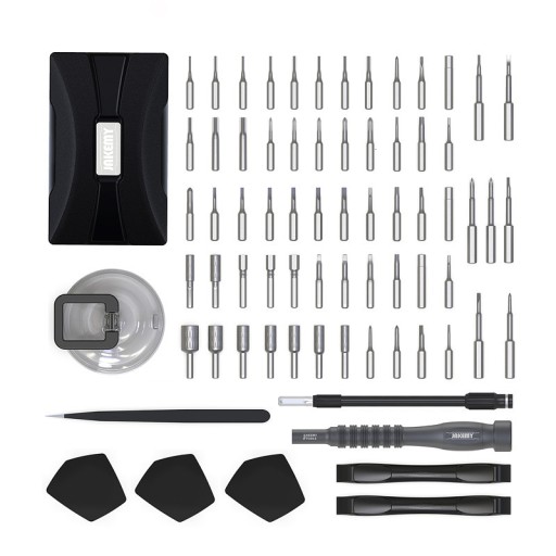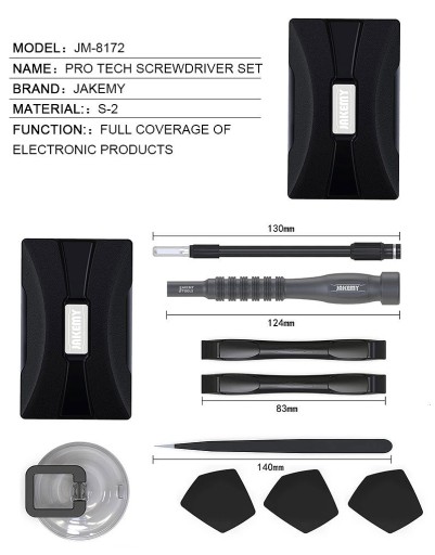 JAKEMY JM-8172 to zestaw 72 precyzyjnych narzędzi, otwieraków i bitów z lekkim aluminiowym uchwytem przeznaczony do precyzyjnych napraw serwisowych telefonów i smartfonów oraz wszelkiej elektroniki konsumenckiej.