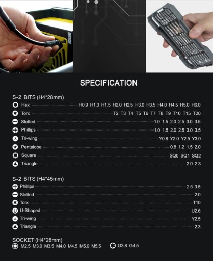 - 63 magnetyczne precyzyjne bity wykonanych ze stali S2 od długości 28 oraz 45mm