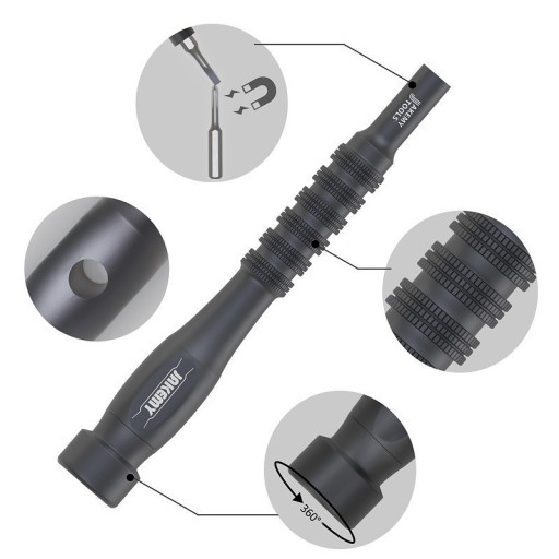 - lekki uchwyt do bitów o długości 12,4cm wykonany ze stopu aluminium z obrotową łożyskowaną końcówką