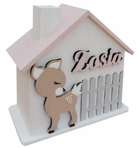 Drewniana, ręcznie malowana skarbonka w kształcie domku, będzie idealnym prezentem dla każdego dziecka na różne okazje. Z przodu skarbonki znajduje się płotek i ręcznie malowany dekor. Na górze w widocznym miejscu widnieje drewniany napis z imieniem dziecka.