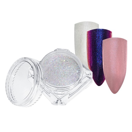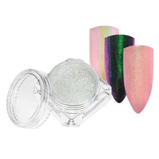 Pyłki do paznokci które tworzą efekt kmeleona oraz efekt lustra wraz z aplikatorem do nakładania pyłku.