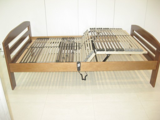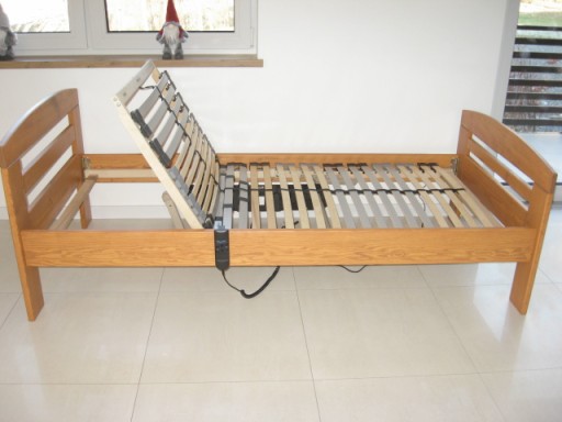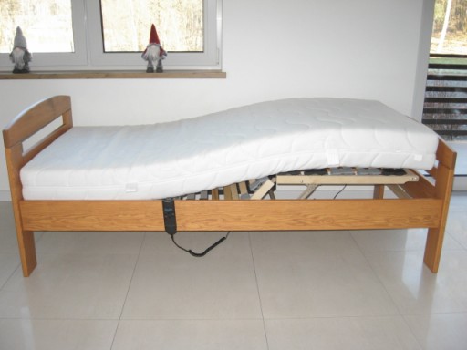 Przedmiotem aukcji jest nowe łóżko ze stelażem elektrycznym. Nowa rama łóżka sosnowa malowana na kolor olcha. .Nowy stelaż przewodowy posiada bardzo elastyczne listewki oraz dodatkowo regulację twardości w środkowej części za pomocą regulowanych podwójnych listewek oraz nowy materac piankowy wysokości od 15 do 17 cm. Materac dwustronny z zamkiem dookoła , wykonany ze specjalnej pianki nacinanej w falę z obydwu stron (nacięcia w falę pozwalają na dobre układanie się materaca przy zginaniu się stelaża).